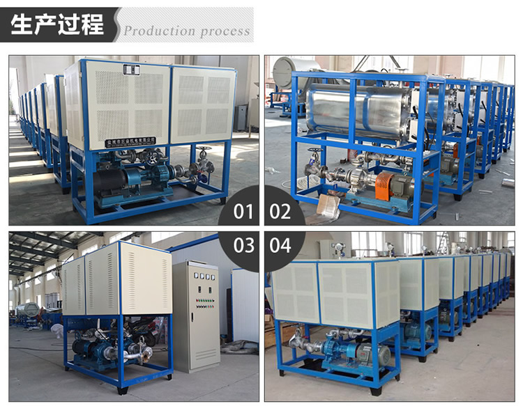 對于電加熱導熱油爐,熱量是由浸入導熱油的電加熱元件產生和傳輸的,以導熱油為介質,利用循環泵,強制導熱油進行液相循環,將熱量傳遞給用一個或多種用熱設備,經用熱設備卸載后,重新通過循環泵,回到加熱器,再吸收熱量,傳遞給用熱設備,從此周而復始,實現熱量的連續傳遞,使被加熱物體溫度升高,達到加熱的工業要求。