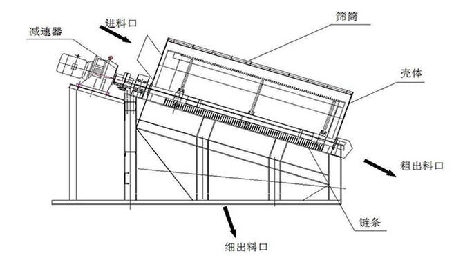 滾筒裝置傾斜安裝于機(jī)架上。電動(dòng)機(jī)經(jīng)減速機(jī)與滾筒裝置通過聯(lián)軸器連接在一起,驅(qū)動(dòng)滾筒裝置繞其軸線轉(zhuǎn)動(dòng)。當(dāng)物料進(jìn)入滾筒裝置后,由于滾筒裝置的傾斜與轉(zhuǎn)動(dòng),使篩面上的物料翻轉(zhuǎn)與滾動(dòng),使合格物料(篩下產(chǎn)品)經(jīng)滾筒后端底部的出料口排出,不合格的物料(篩上產(chǎn)品)經(jīng)滾筒尾部的排料口排出。由于物料在滾筒內(nèi)的翻轉(zhuǎn)、滾動(dòng),使卡在篩孔中的物料可被彈出,防止篩孔堵塞。滾筒篩砂機(jī)、滾筒篩分機(jī)與滾筒篩的原理構(gòu)造幾乎相同,是人們對(duì)它的認(rèn)識(shí)和叫法上存在差異。