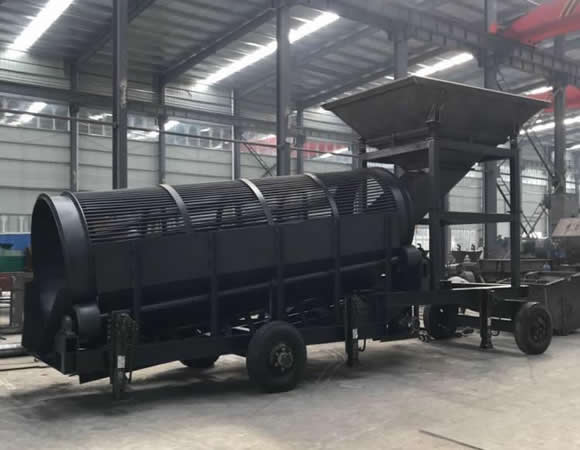 移動式砂石滾筒篩主要有電機、減速機、滾筒裝置、機架、密封蓋、進出料口組成。整體與地平面成傾斜狀態,外部被密封隔離罩所密封,以防止污染環境。通過變速減速系統使篩分筒在一定轉速下旋轉,物料自上而下通過篩分筒得到分離,細料從篩分筒前端下部排出,粗料從篩分筒下端尾部排出。
